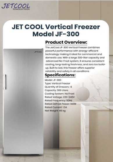 The JetCool JT-300 Vertical Freezer combines powerful performance with energy-efficient technology making it ideal for commercial and domestic use. With a large 300-liter capacity and advanced No-Frost system, it ensures consistent cooling, long-lasting freshness, and zero ice build-up. Built to last, this freezer offers superior reliability and safety in all conditions.